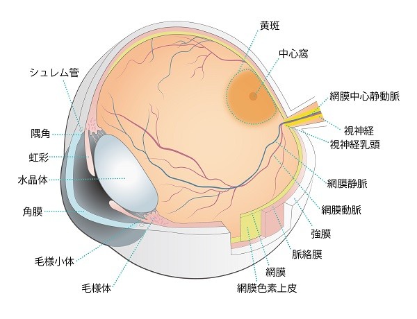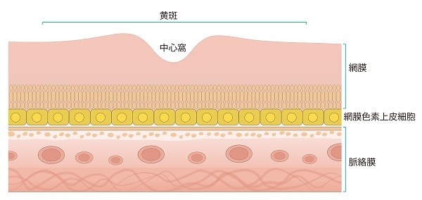 網膜はカメラのフィルムに相当し、外からの光が瞳(瞳孔)、レンズ(水晶体)や目の中央部(硝子体)を通り、網膜に当たり光を感じます(図1)。黄斑とは網膜の中心にある直径1.5mm~2mm程度の小さな部分の名称です。網膜の中心部(黄斑)では大変良い視力が得られますが、それ以外のところでは正常の目でも十分良い視力は得られません。したがって、黄斑が障害されるとそれ以外に網膜に異常がなくても視力が著しく低下し、運転免許を更新したり、字を読むことができなくなったりします。網膜の下には網膜色素上皮という一層の細胞があり、その下に脈絡膜という血管に富んだ組織があります(図2)。網膜が正しく働くためには網膜の下にある網膜色素上皮やその下にある脈絡膜が正しく働く必要があります。