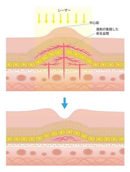 ビスダイン®という光感受性物質を点滴し、その後に非常に弱い出力の専用のレーザーを病変に照射する治療法です。治療を行う前に造影検査を行い、脈絡膜新生血管をはじめとする病変を確認して、病変の大きさに合わせてレーザーの照射範囲を決定します。治療後48時間は強い光に当たらないように注意する必要があります。治療後48時間以内に強い光に当たると光過敏症などの合併症が起こることがあります。光線力学的療法は必ずしも一度で終了するとは限りません。治療のためには専用のレーザー装置が必要であり、眼科PDTの認定医が行う必要があります。