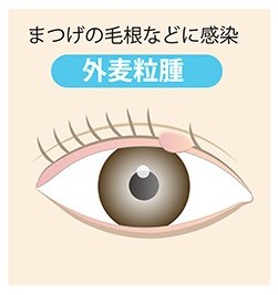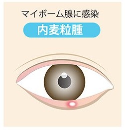 俗に「ものもらい」と呼ばれるもので、原因は細菌感染によるものです。眼瞼(まぶた)には、涙や汗の分泌腺や毛穴がありますが、その小さな孔から細菌が感染して症状を引き起こします。感染した場所により外麦粒腫(図1)と内麦粒腫(図2)に分類されます。